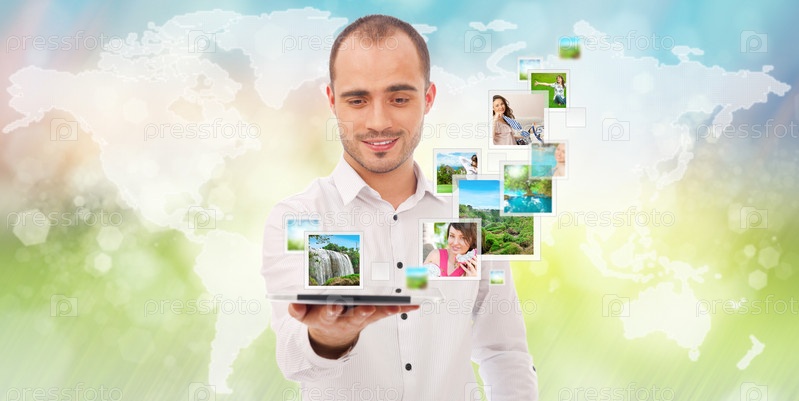 Портрет молодого мужчины с фото и видео файлами в социальных сетях. Современный планшетный компьютер