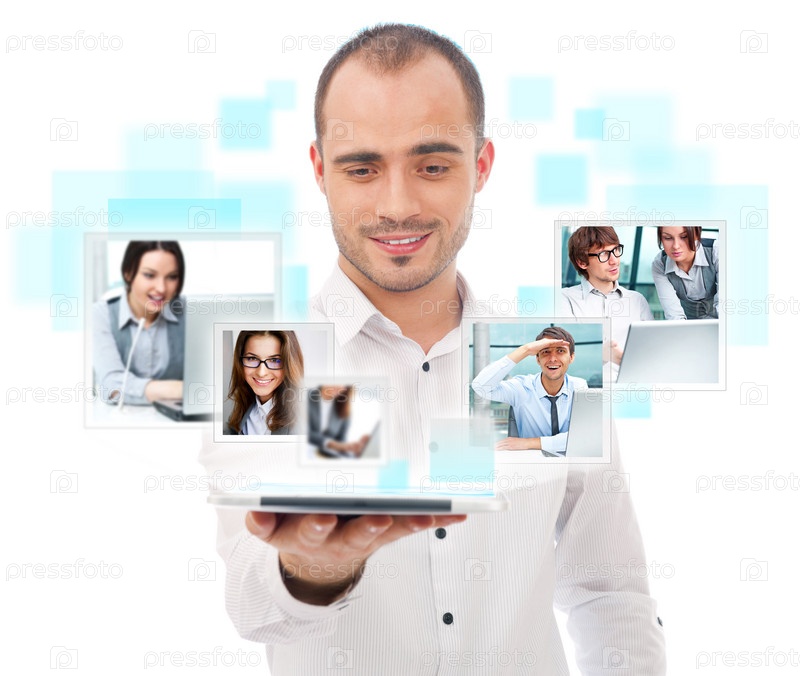 Взрослый бизнесмен и планшетный компьютер для общения. Технология виртуального совещания, концепция глобального бизнеса