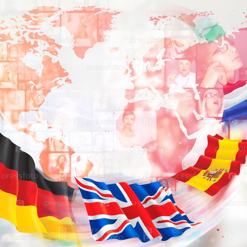 Фото разных людей на карте мира и флаги. Языковые курсы и концепция международного образования