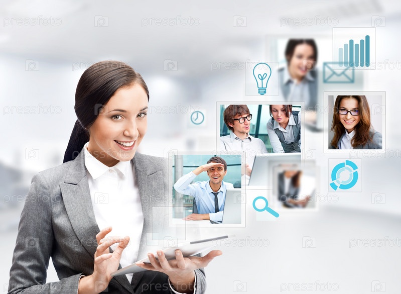 Портрет бизнес-леди с планшетным компьютером для общения с командой по всему миру. Концепция международных коммуникаций