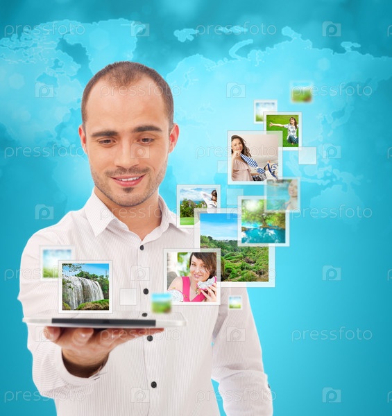 Портрет молодого мужчины с фото и видео файлами в социальных сетях на фоне карты мира