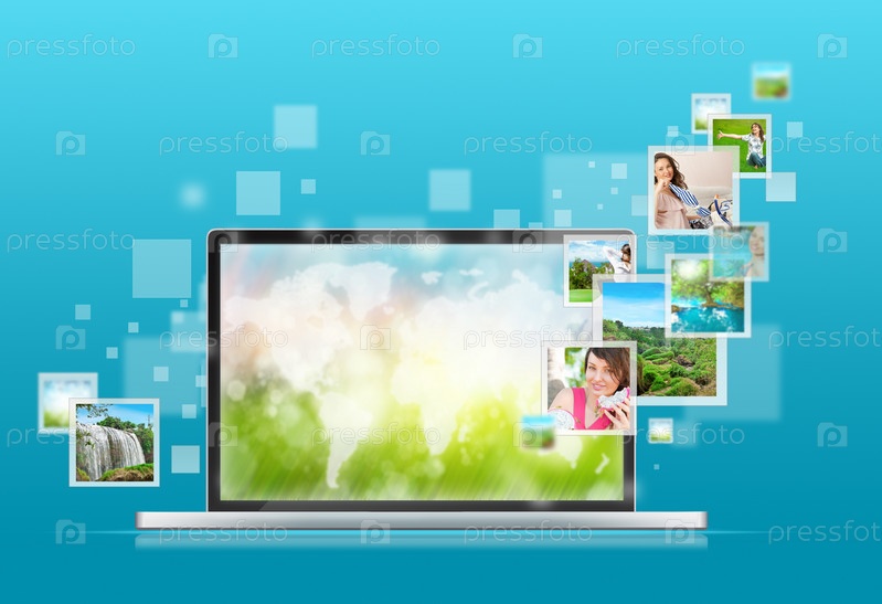 Открытый ноутбук на синем фоне. Летящие из экрана изображения