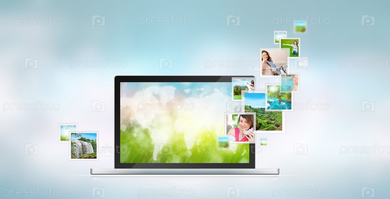Открытый ноутбук на синем фоне. Летящие из экрана изображения