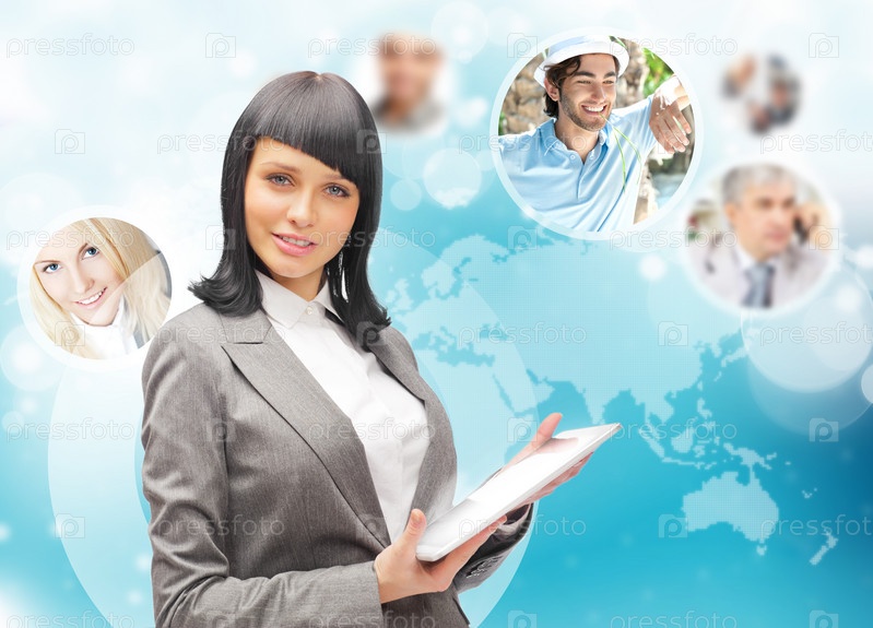 Портрет бизнес-леди с планшетным компьютером для общения с командой по всему миру. Концепция международных коммуникаций
