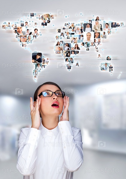Портрет молодой женщины, общение с друзьями по всему миру. Карта мира с фото людей. Концепция международных коммуникаций