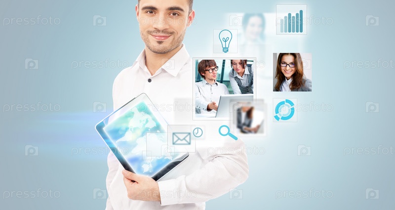 Взрослый бизнесмен с планшетным компьютером для общения с командой. Технология виртуального совещания для концепции глобального бизнеса