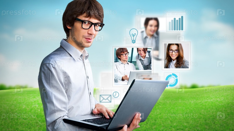 Взрослый бизнесмен с планшетным компьютером для общения с командой. Технология виртуального совещания для концепции глобального бизнеса