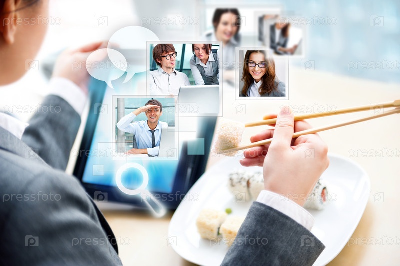 Бизнес-леди в кафе с бесплатным подключением к интернету. Общение с партнерами, используя планшетный компьютер