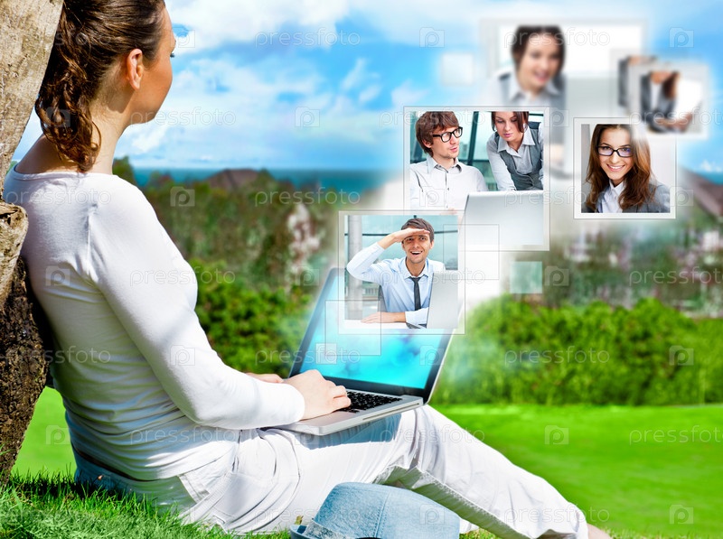 Взрослая женщина сидит под деревом на зеленой траве и общается с командой, клиентами или партнерами. Концепция интернет-бизнеса