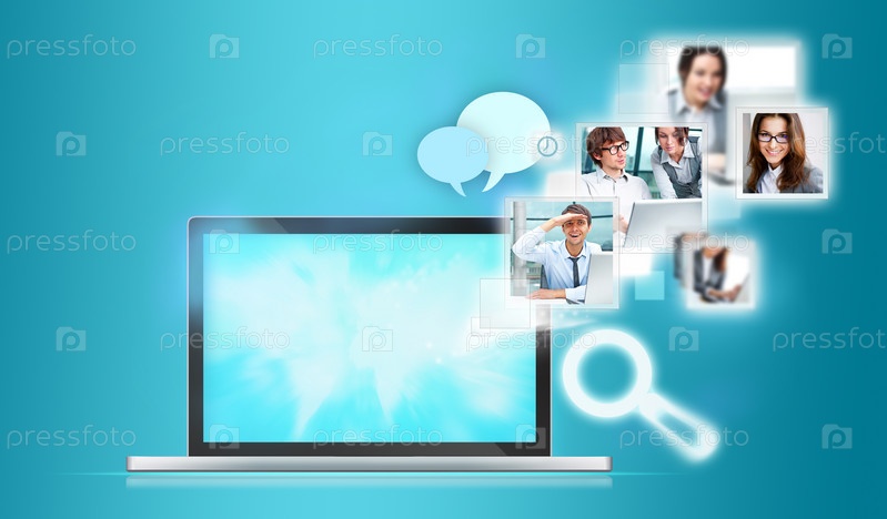 Открыттый ноутбук на синем фоне. Летящие изображения из экрана