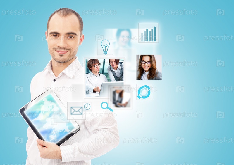 Взрослый бизнесмен и планшетный компьютер для общения с командой. Технология виртуального совещания для концепции глобального бизнеса
