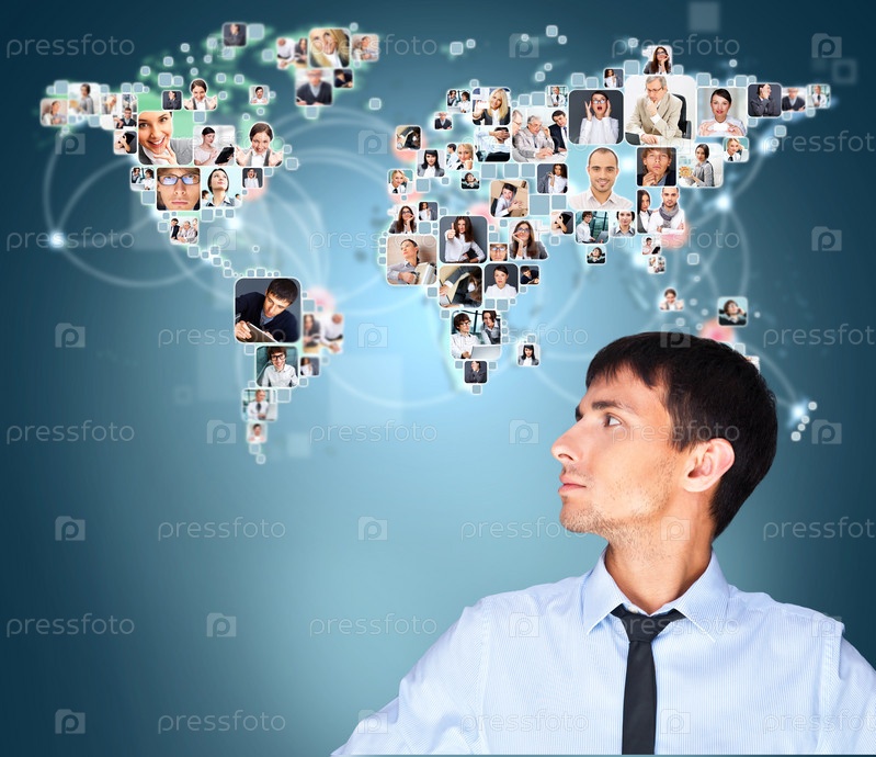 Мужчина общается со своими друзьями по всему миру. Карта мира с фото людей. Концепция международных коммуникаций