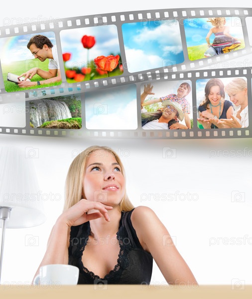 Молодая женщина с изображениями вокруг головы, представляющими технологии медиа- развлечений на белом фоне