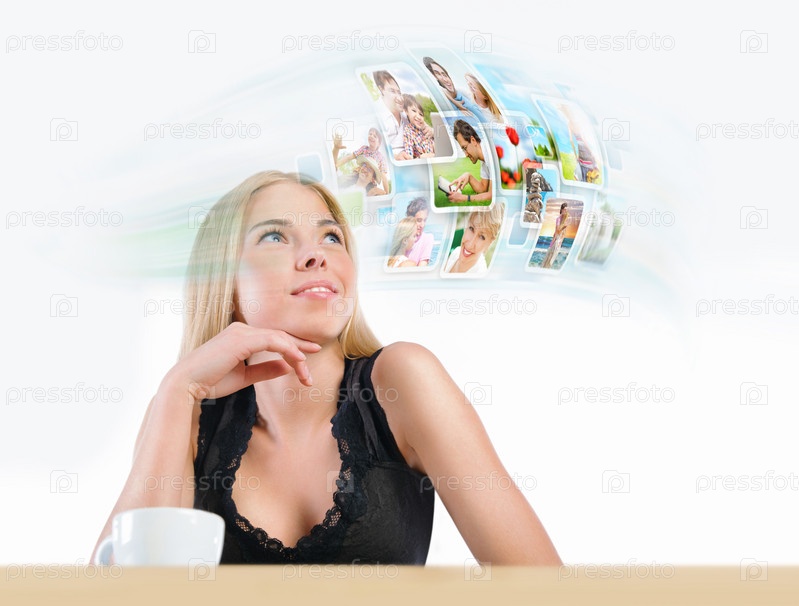 Молодая женщина с изображениями вокруг головы, представляющими технологии медиа- развлечений на белом фоне
