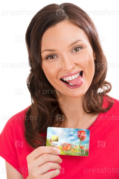 Позитивная женщина с банковской пластиковой кредиткой или дебетовой карточкой
