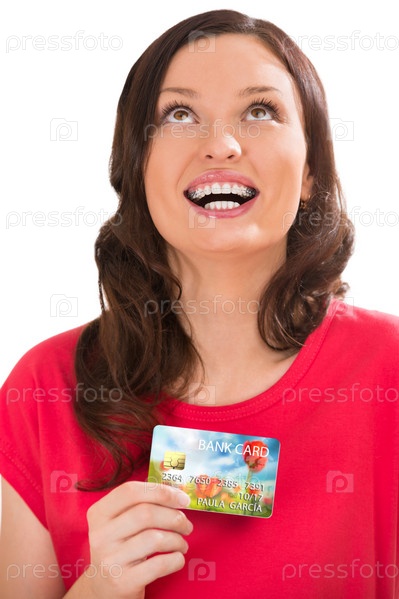 Позитивная женщина с банковской пластиковой кредиткой или дебетовой карточкой