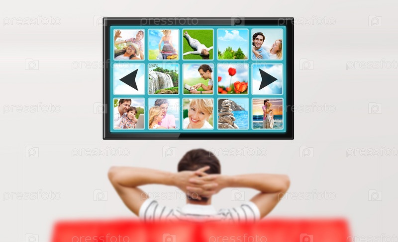 Человек смотрит телевизор. Редактируемое пространство для текста на экране