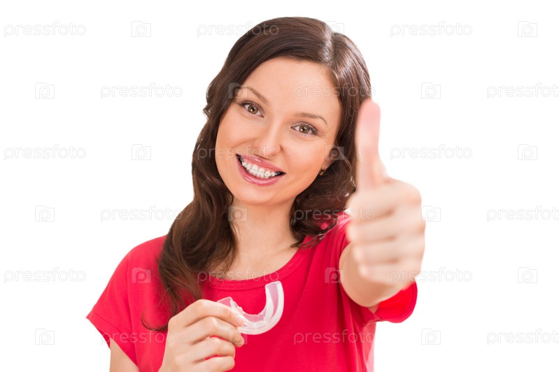 Очаровательная женщина держит силиконовую зубную пластинку и улыбается