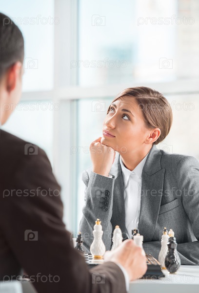 Деловые люди играют в шахматы в офисе. Концепция стратегии бизнеса