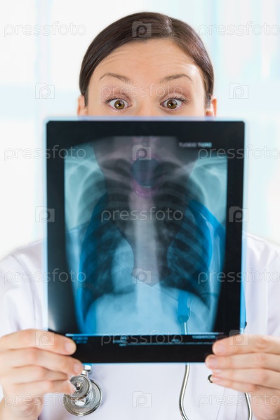 Удивленная женщина-врач смотрит на рентген легких или позвоночника
