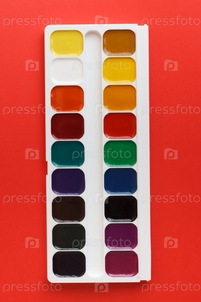 Акварельные краски на красном фоне