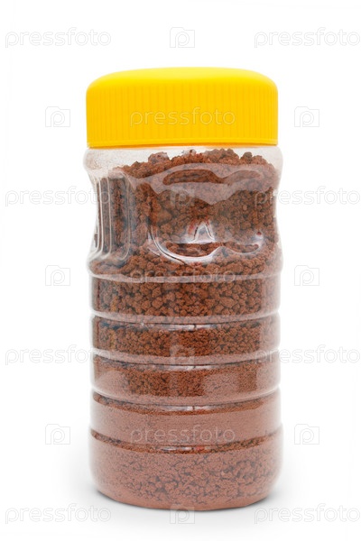 Быстрорастворимый чай в пластиковой банке, изолированный на белом фоне