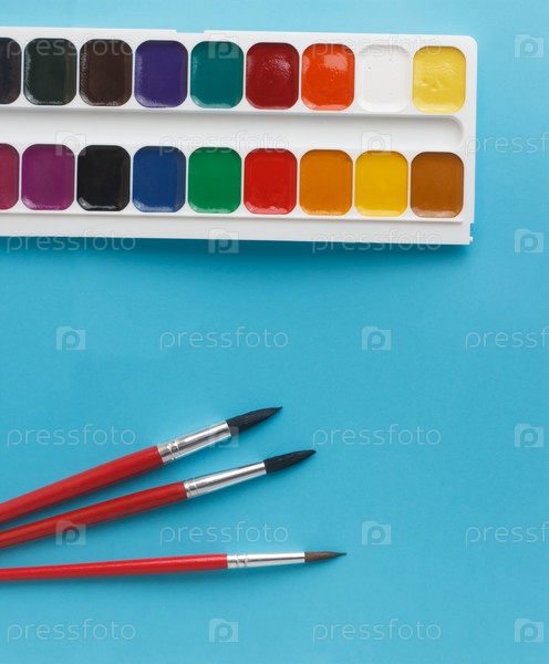 Акварельные краски и кисти на синем фоне