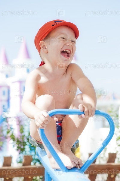 Счастливый ребенок качается на качелях