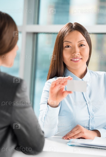Две бизнес-леди достигли соглашения и обмениваются визитными карточками