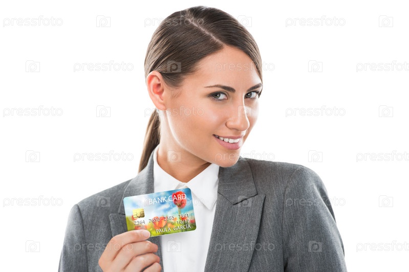 Портрет молодой бизнес-леди с кредиткой, изолированной на белом фоне