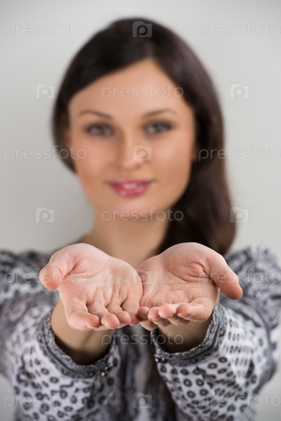 Хорошенькая молодая брюнетка с руками, сложенными вместе, показывает что-то