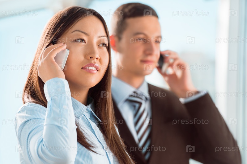 Успешные деловые люди говорят по сотовым телефонам, стоя в офисе или коридоре