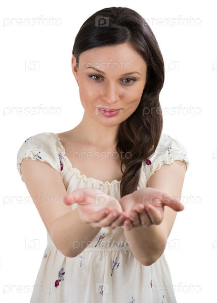 Портрет очаровательной молодой женщины, представляющей ваш продукт на белом фоне