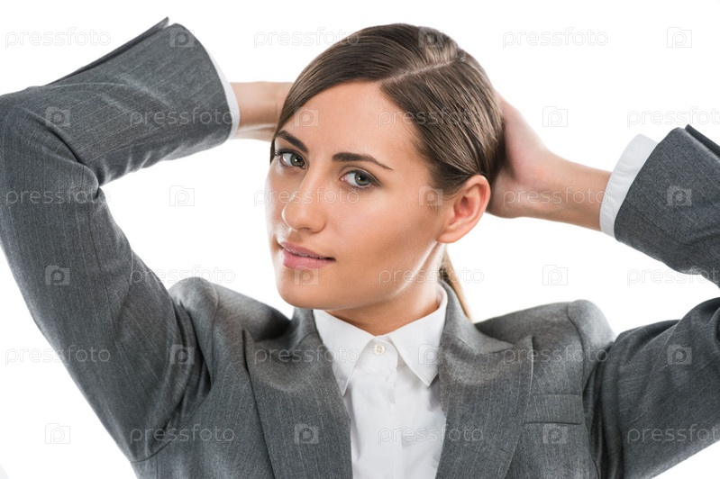 Улыбающаяся бизнес-леди с руками за головой, изолированная на белом фоне