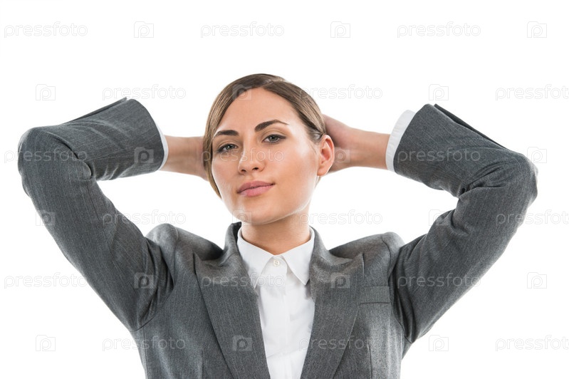 Улыбающаяся бизнес-леди с руками за головой, изолированная на белом фоне