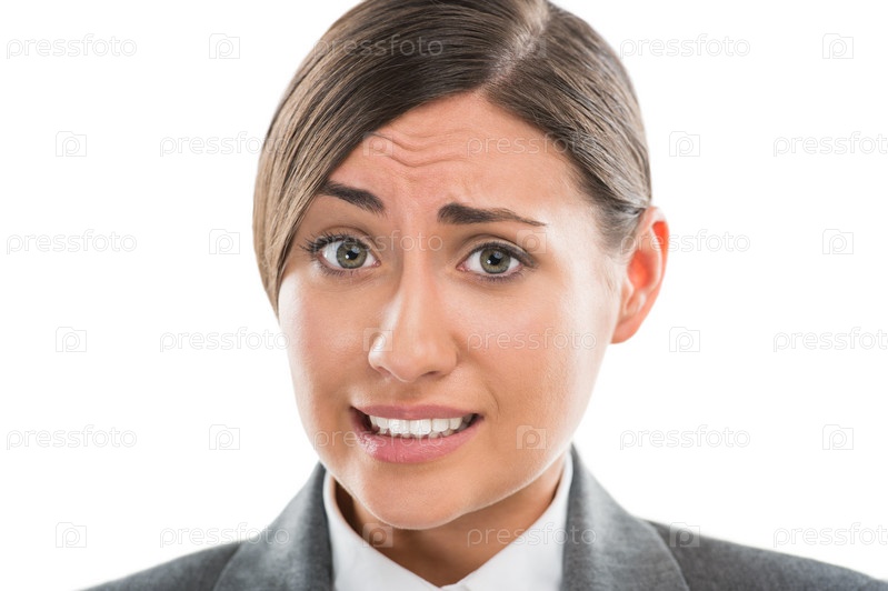 Портрет шокированной и растерянной деловой женщины на белом фоне