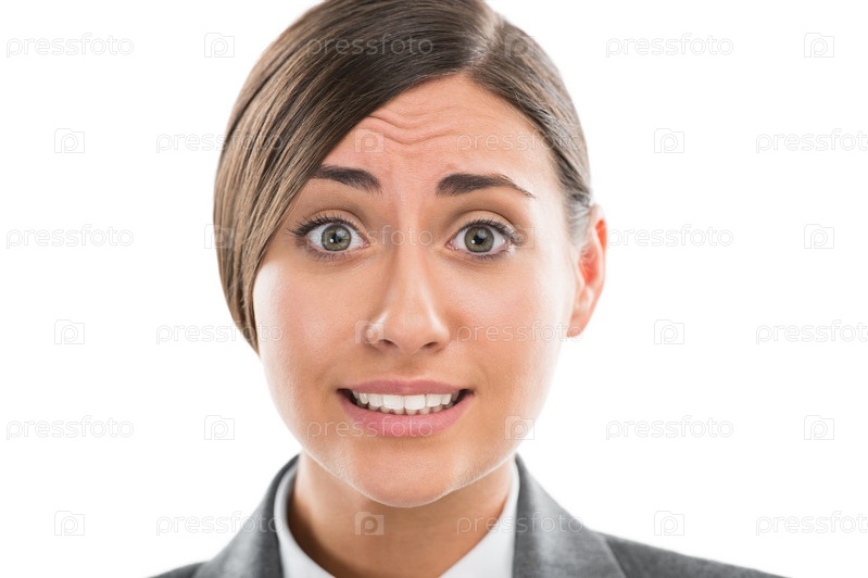 Портрет шокированной и растерянной деловой женщины на белом фоне