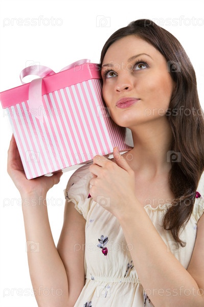 Молодая женщина приложила подарок к уху, завернутый в красную бумагу, изолированная на белом