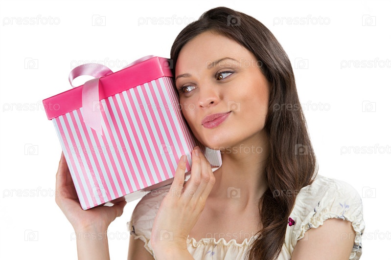 Молодая женщина приложила подарок к уху, завернутый в красную бумагу, изолированная на белом