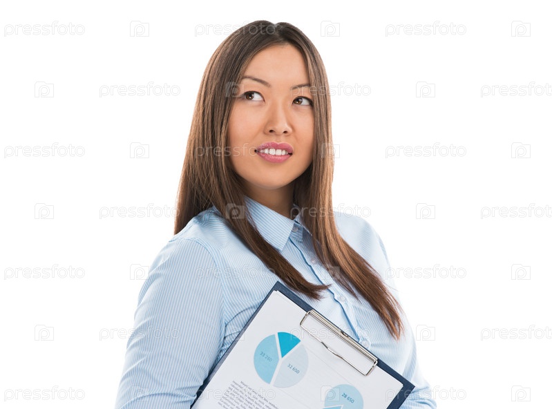Азиатская бизнес-леди держит отчеты и улыбается