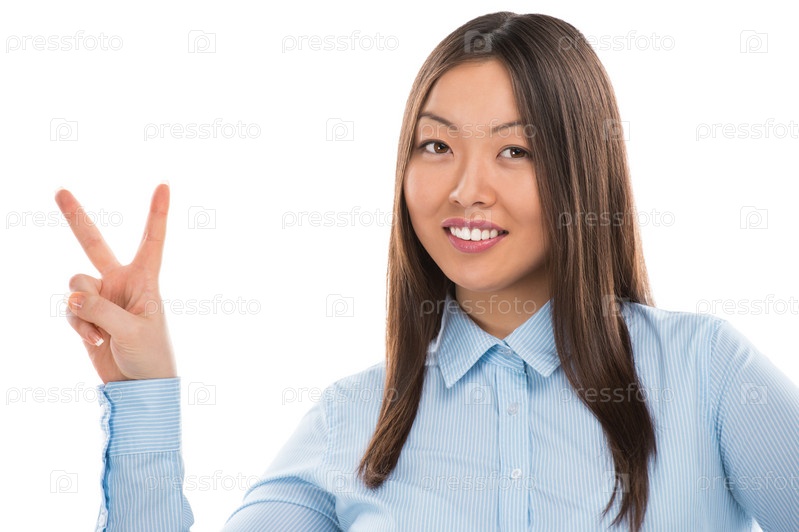 Портрет уверенной молодой бизнес-леди с жестом победы на белом фоне