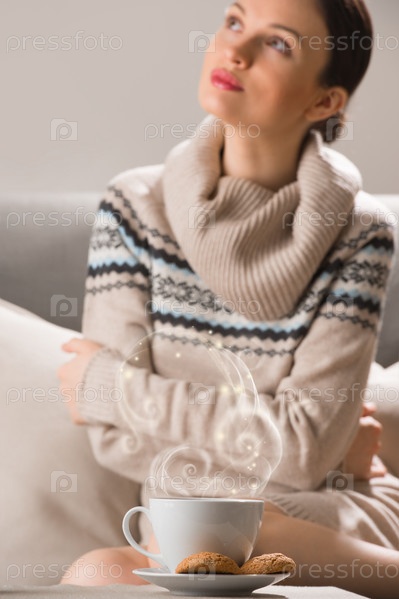 Чай или кофе с овсяным печеньем на столе в кафе или дома. Женщина сидит на заднем плане