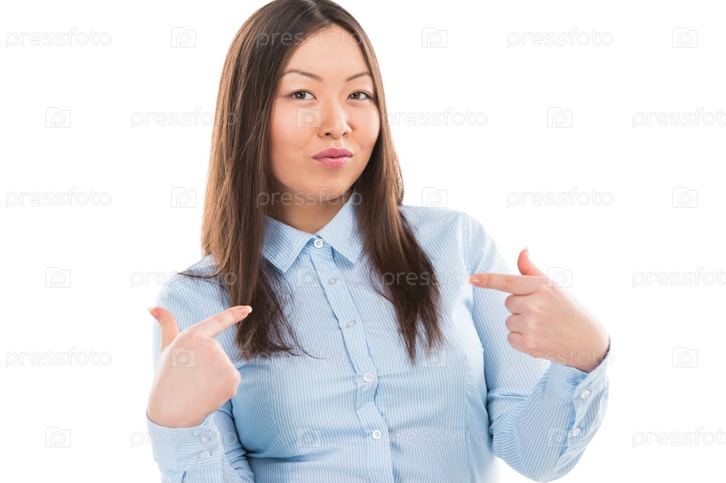 Портрет азиатской бизнес-леди с жестом "выберите меня", изолированный на белом фоне