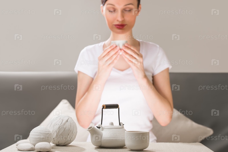 Задумчивая красивая молодая женщина сидит на диване. Чайный набор на столе