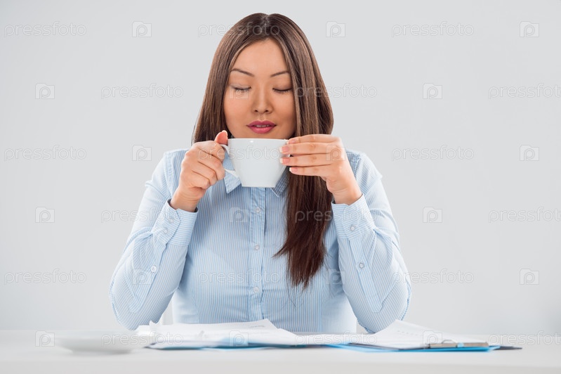 Молодая бизнес-леди держит чашку кофе