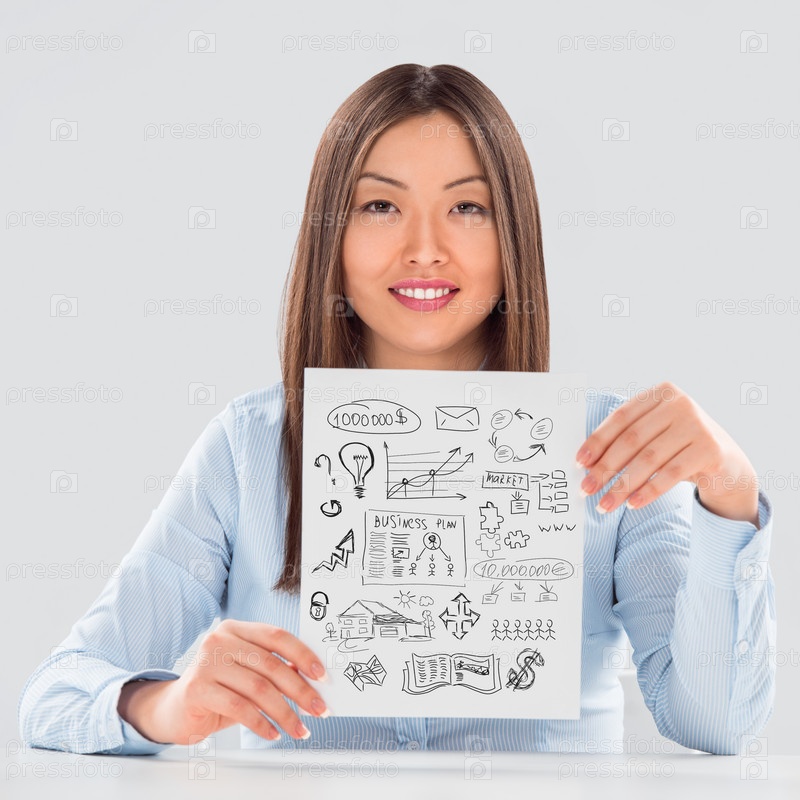 Молодая деловая женщина показывае лист бумаги с планами