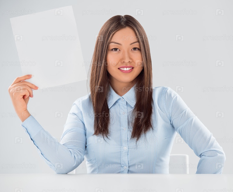 Портрет деловой женщины с чистым листом бумаги на сером фоне