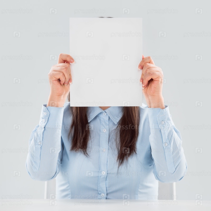 Портрет деловой женщины с чистым листом бумаги на сером фоне