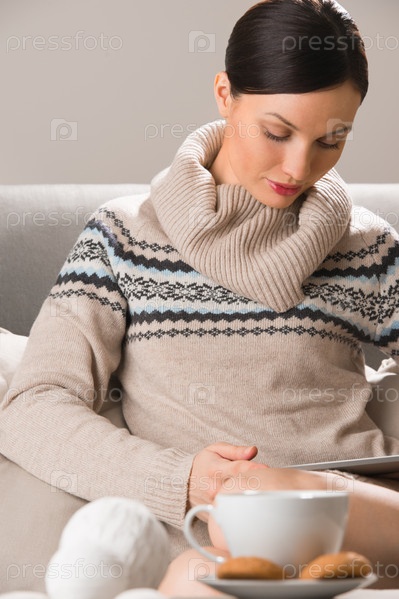 Девушка использует планшетный компьютер дома перед сном. Чашка кофе с печеньем на столе на переднем плане