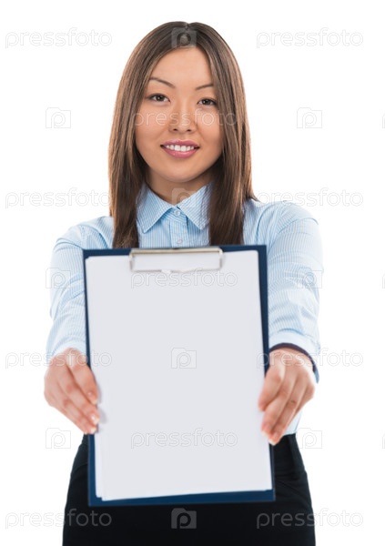 Портрет счастливой молодой деловой женщины, стоящей с планшетом на белом фоне
